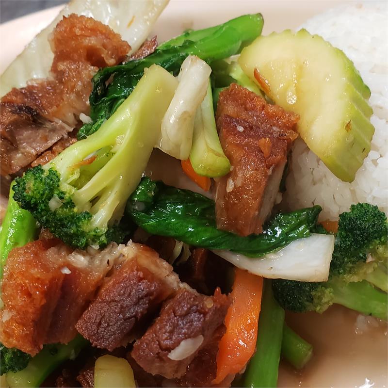 | Stir-fried with red and green bell peppers, chili garlic sauce and basil leave. | ||