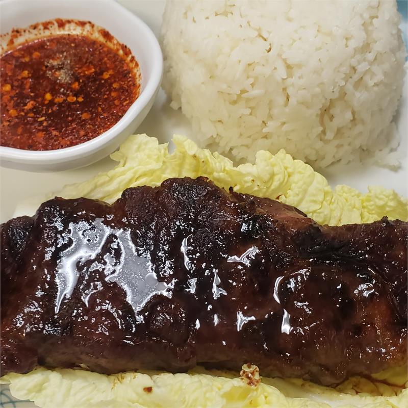 | Grilled marinated beef, served with teriyaki sauce and vegetables. | ||