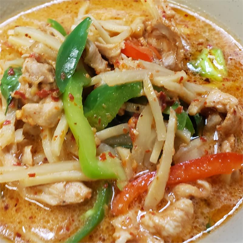| Stir-fried bamboo shoot, bell peppers, onion, and fresh green chili. | ||